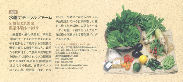 | 380-0888 長野県長野市大字上ヶ屋2471-2198 TEL 026-239-2630 FAX026-239-2736 URL:http://suirin-naturalfarm.com/ |