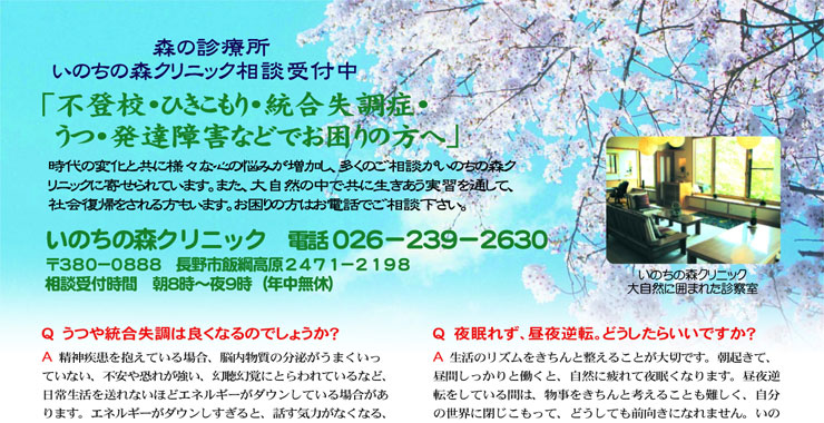 青少年に関する相談も受付中。 時代の変化と共にひきこもり・不登校・うつ・統合失調・摂食障害など心の悩みが増加し、多くの相談がいのちの森クリニックに寄せられています。 昼夜逆転、人とうまく付き合えない、仕事が続かない、幻聴幻覚がある、家から出られなくなったなど様々な相談があります。 またこれまで400人以上の青少年の社会復帰に携わってきましたので、お電話で状況をお聞かせ頂くだけで、入院治療が必要なのか、ご自宅で通院したほうが良いのか、あるいは「生き方と働き方の学校」でよくなる可能性があるのか、ある程度判断が可能です。 大自然の中で共に生きあう実習を通して、社会復帰をされる方もいます。調子が悪いお子さんは自ら進んで一歩を踏み出すことがなかなかできませんので、お困りのご家族の方はご相談下さい。 担当:巽先生・帯津先生・井上先生・久間先生・宮島先生・栗林先生・塩澤先生・山下先生 いのちの森青少年相談受付担当:山下先生(初回電話相談無料) ●詳細は > こちら |