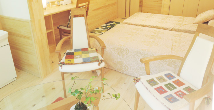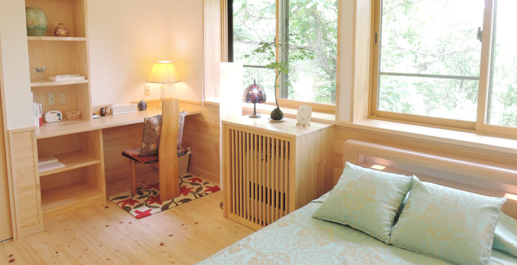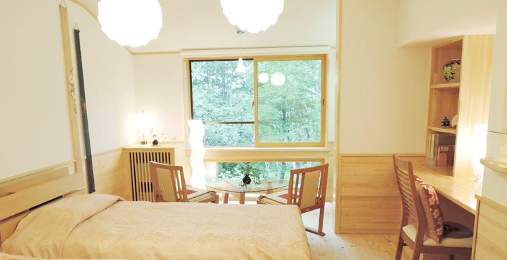 総天然木、建築医学の立場から健康に配慮された設計、身体に触れる所、トイレ、洗面所まですべて総檜、天井は杉、照明は全館美濃和紙を使用、室内はもとより壁は呼吸の出来るエコロジー。各部屋にある絨毯は手織り草木染めのウール100%、寝具は清潔を保ち、ガラスにいたるまで塵一つない清潔な館内。