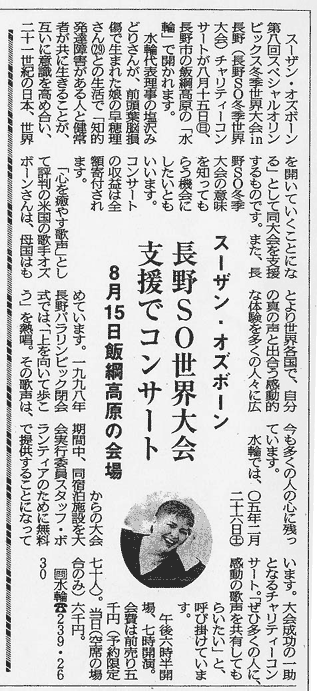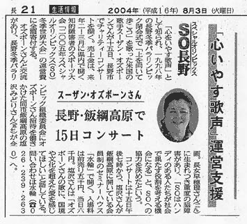 2004年8月3日 スーザン・オズボーンSOチャリティーコンサート(信濃毎日新聞)