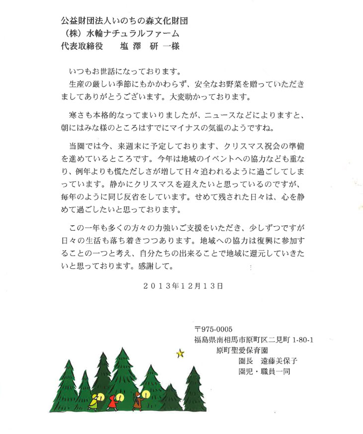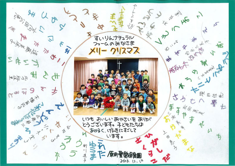 2013/12/12 原町聖愛保育園のみんなから寄せ書きを頂きました。ありがとうございます!