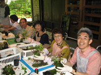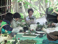 コケ玉には小さな宇宙があります。この小さなコケ玉の中に、枯れてはまた芽生え、育ち、花をつけ、実をつけ、そしてまた枯れていく・・・と言った命の循環があります。何といっても鉢植えと違った愛らしさがあります。お部屋やトイレの中などちょっとした所においても何とも言えない味わいがあり、こけ玉を一つ置くだけでお部屋の雰囲気が違ってきます。散策しながらお好きな山野草(紅葉、松、つゆくさ…)などを採取し、あなたのこけ玉を作ってみましょう。冬でも苗をポットで育てていますので一年中こけ玉作りは可能です。 2ヶ 会員¥3,000 一般¥4,000 一緒に作ってみましょう。始めての方でもとっても簡単で、お水さへあれば何年も楽しめます。 |