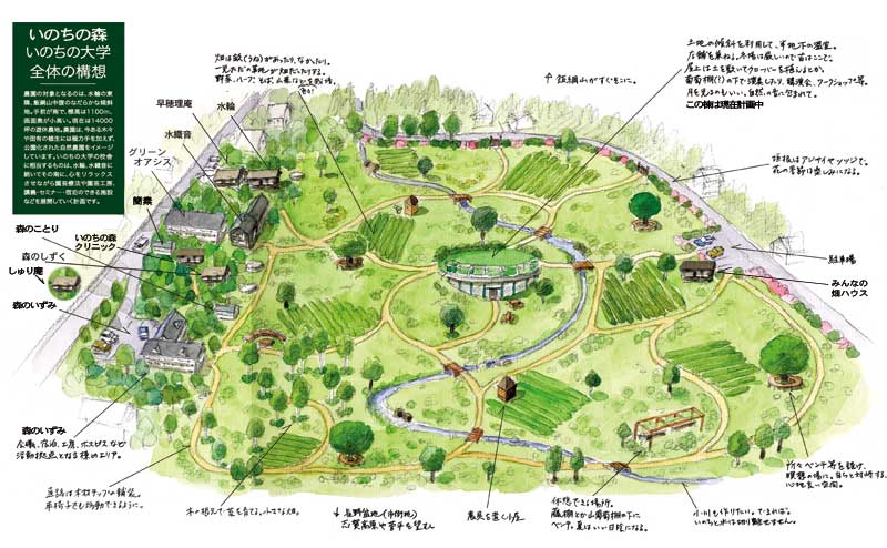 | いのちの森文化プロジェクトの専従スタッフは、基本1年間の研修期間を終了し、登用されます。 共同生活と仕事を通して自己を磨き、奉仕の精神を学び、世のため人のための己の使命を全うしたいと願う志ある人々によって、営まれています。 その志を持つ水輪の会から生まれた、 (公財)いのちの森文化財団、 いのちの大学 生き方働き方学校、 いのちの森水輪リトリートセンター、 農業生産法人水輪ナチュラルファーム光の水自然農園、 (有)グリーンオアシスレストラン、 いのちの森自然菓子工房、 いのちの森クリニック がリンクしあいながら、いのちの構想の活動を展開しています。 人生と仕事と生活を分離したものとせず、全ては自分の学びと気づきの実践である生活・仕事の創造と、奉仕する精神を培います。 自分を高め、共に社会の福祉・環境・教育・農業など、いのちがいきいきと輝く人生を共に実践する若者達が志願しています。学歴は一切問いません。求める心を重視します。 |
